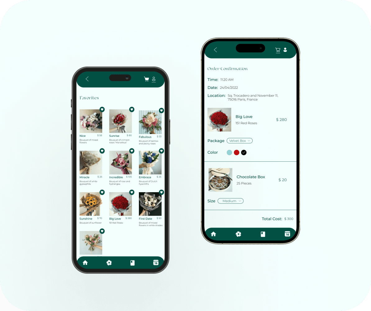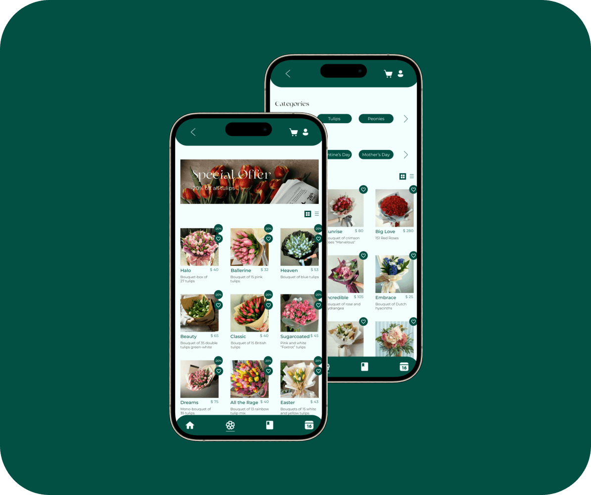 Effective presentation of flowers and bouquets in the app, including high-quality images and product information, facilitates user decision-making and increases the likelihood of placing an order.